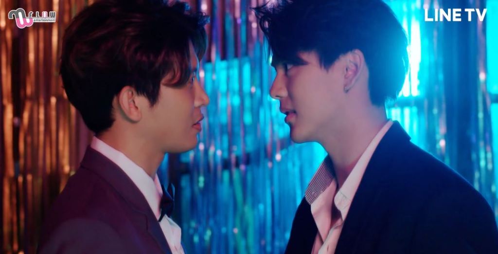 Paper rejects Thong Fah at first. This happens when they are drunk and one of them tries to kiss the other. This scene is one of the best in the series and the best one for the couple. Paper, played by Tong Thanayut (of TharnType fame) is a decent actor. This scene is meant to show us internalized homophobia and its consequences. Paper’s reaction is pretty realistic. He walks out after the kiss and leaves Tong Fah crying. This ties with the cold open of the series, in which Tong Fah pursues Paper at the swimming pool and falls into the pool. We see him sink, an image that is repeated in the ending credits of all the episodes. I think this image represents his loneliness. Eventually, Paper gives Tong Fah a second chance, and they they become a couple. In the last scene in the last episode, we see Paper swim towards him and join him in the pool. This symbolizes the fact that Tong Fah doesn’t feel alone anymore.